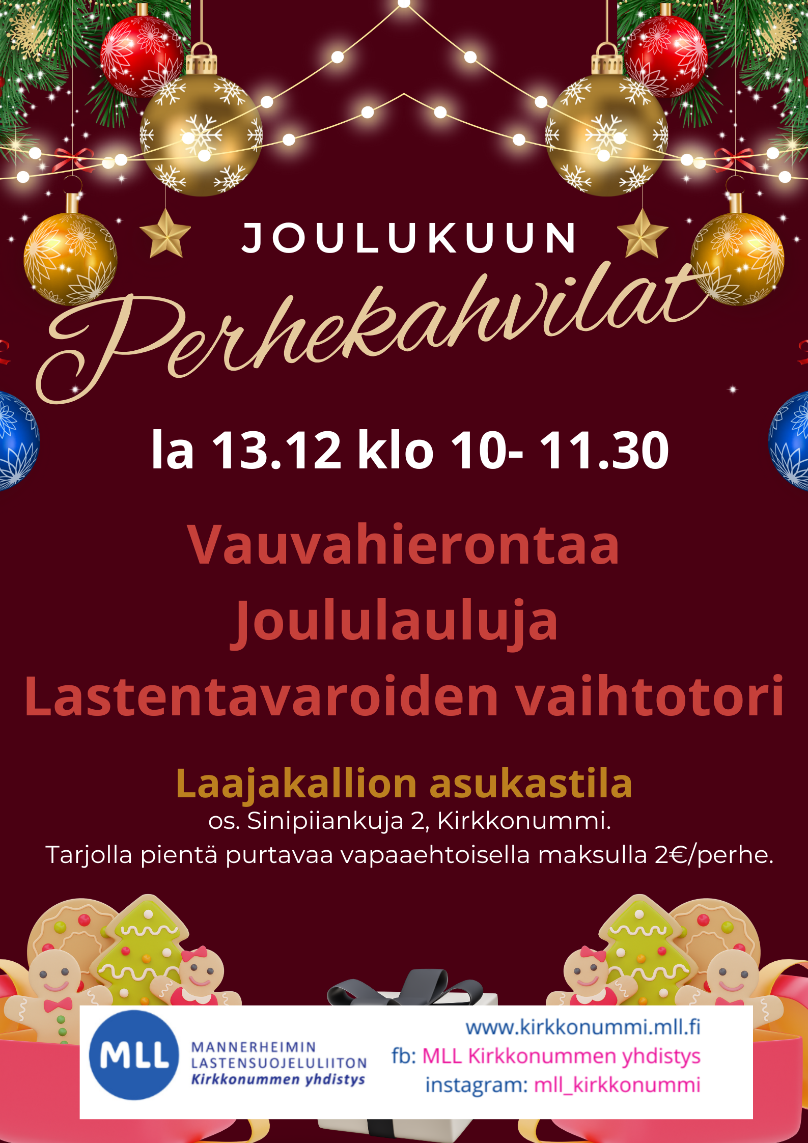 Jos olet kiinnostunut perhekahvilatoiminnasta, ole rohkeasti yhteydessä perhekahvilavastaava Niinaan: perhekahvila.mll.kirkkonummi@gmail.com